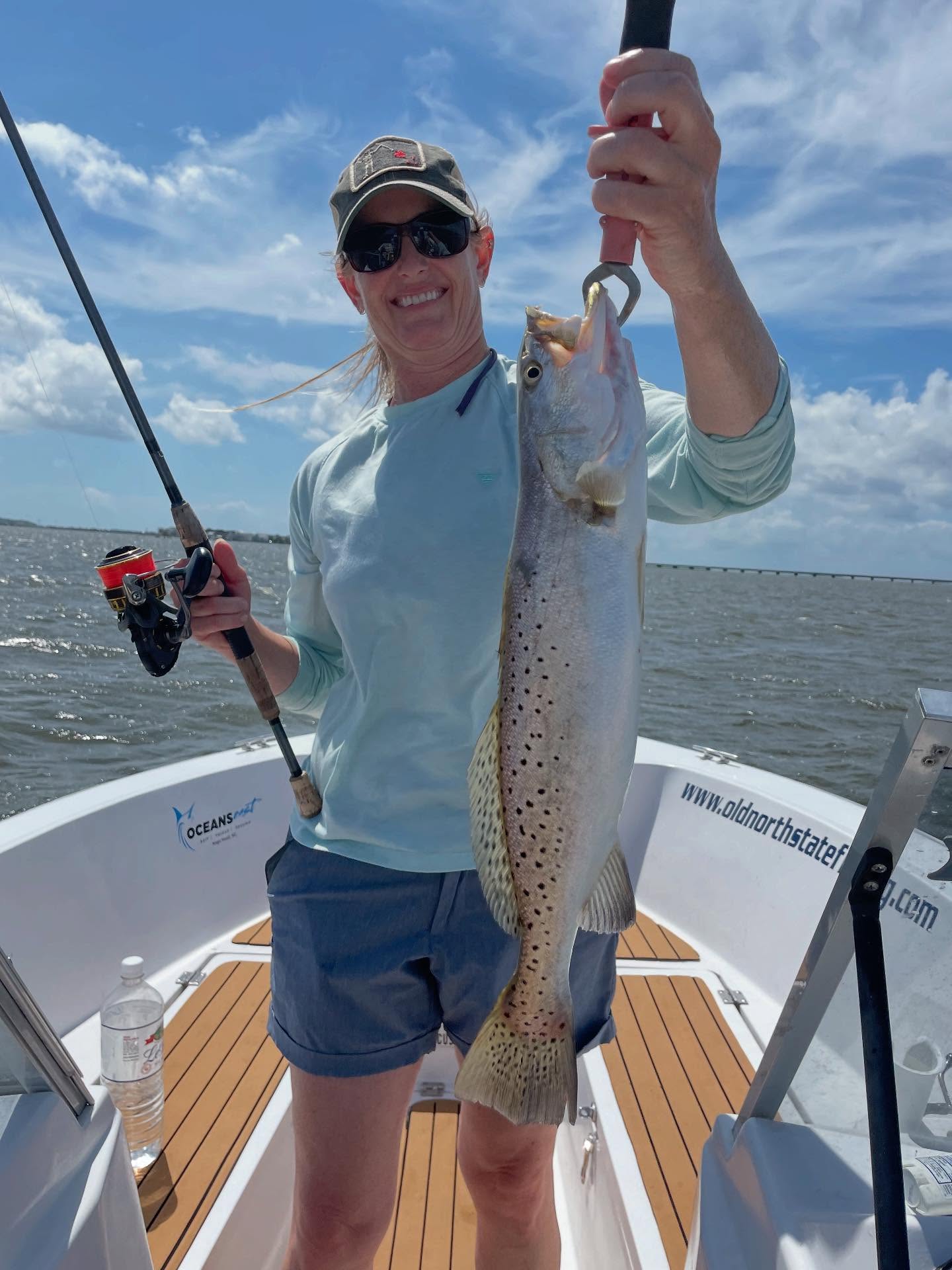 Had a friend from college on board today and got her on some fish! Always good catching up with old friends!!! @mermwood2 @oceanseastobx @wanchese_marina_obx @smithoptics @olukai @xtratuf @lowrancefishing @suzukimarineusa @minnkotamotors @daiwausa @zmanfishingproducts